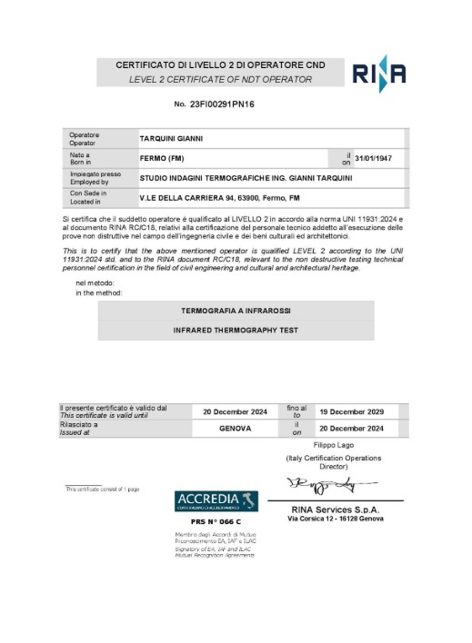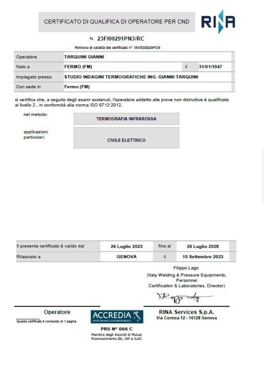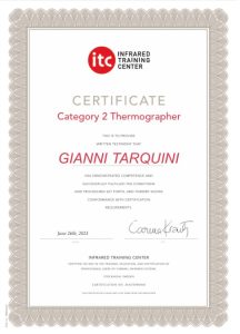 A metà del 2000, con l’iscrizione dell’ing. Tarquini nell’elenco della Regione Marche in qualità di Tecnico competente in acustica ambientale, lo studio ha operato anche nel campo della Certificazione acustica degli edifici. Nello stesso periodo l’ing. Tarquini assiste all’indagine termografica di un impianto elettrico ed ha modo di apprezzare i risultati ottenuti con questa tecnica. Tecnica che permette di operare in tutta sicurezza in quanto non richiede “contatti” con l’impianto esaminato ed evita il “fermo” dell’impianto stesso.